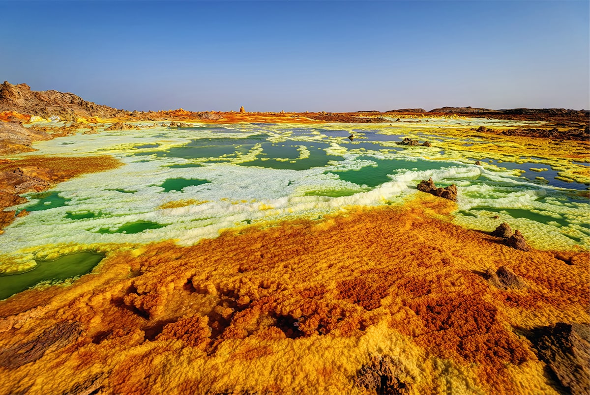 روز را با بازدید از منطقه سولفوریک و حوضچههای رنگارنگ دلول آغاز میکنیم؛ مناظری خارقالعاده با رنگهای زرد، سبز و نارنجی در یکی از پست ترین نقاط کره زمین. سپس به سمت آتشفشان ارتااله میرویم و در صورت امکان از دهانه پرگدازه آن دیدن میکنیم. دیدن گدازه های آتشفشانی در شب و از فاصله ای نزدیک تجربه ای منحصر به فرد است که فقط در اتیوپی امکان پذیر است. شب در کمپ اقامت خواهیم داشت.